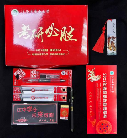 有实用靠谱的考研大礼包。“孔庙祈福”考试专用涂卡套装、晨光水笔和替芯、“虎虎生威、逢考必过”考研爱心助考餐券,学校特制版“虎虎生威”书签等。考前,学校就为全体考研学子送上了考研爱心大礼包,预祝大家成功上岸、金榜题名!